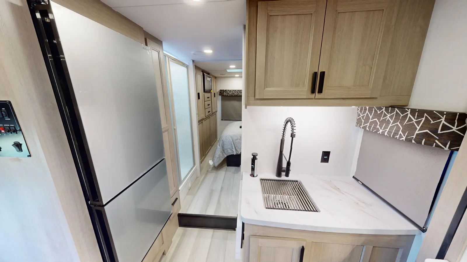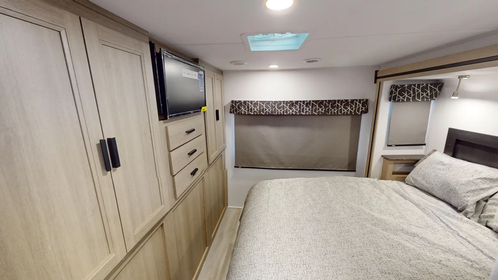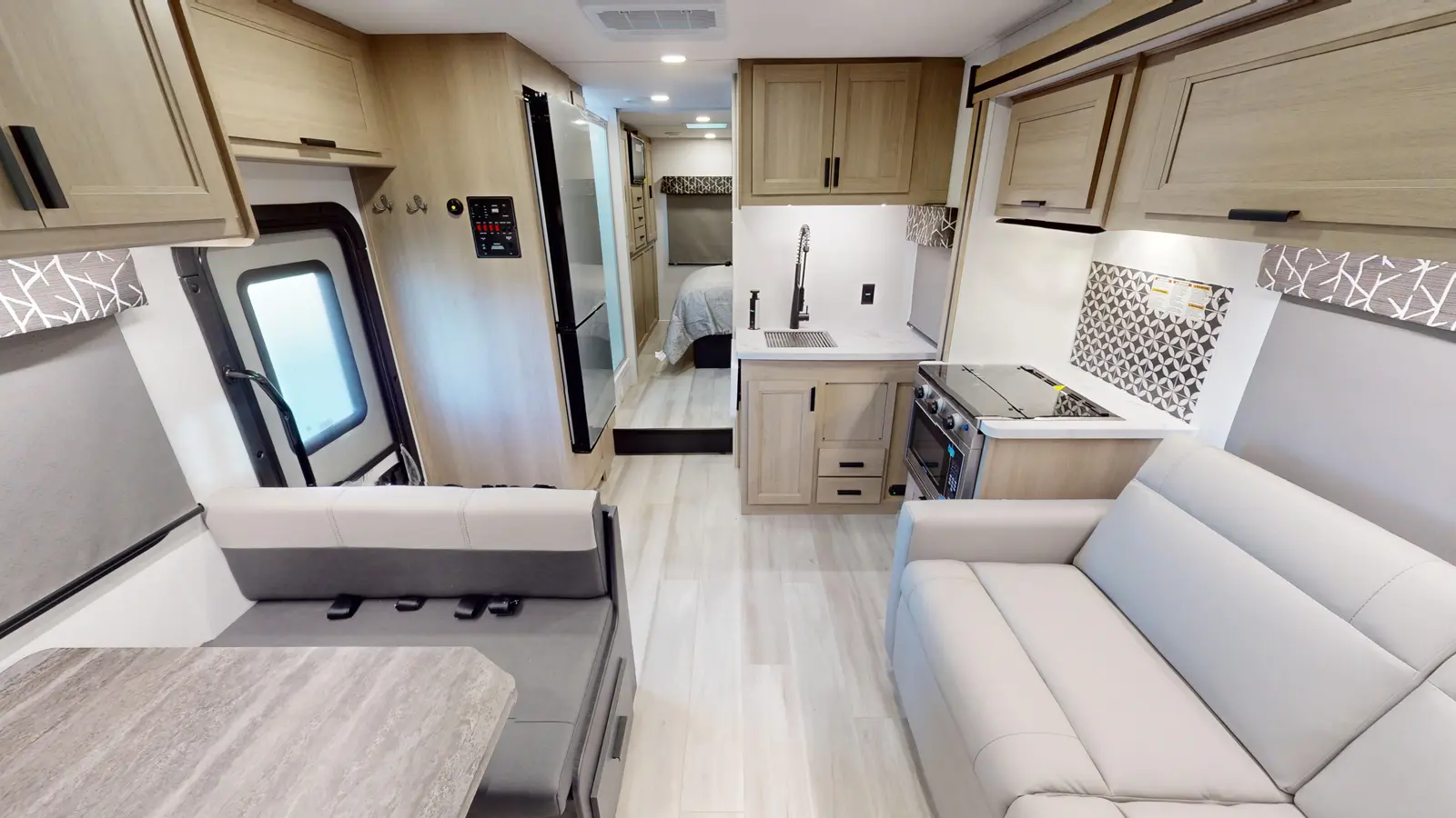 The 2861DS is distinguished by its full outdoor kitchen, which includes a 12V refrigerator, 12V TV, induction burner, and sink with its own dedicated gray tank. Inside, there's a 60" x 80" mattress in the cab over bunk. There's a large couch and booth dinette, plus a well-equipped kitchen that includes a 12V 10 cu ft refrigerator. Past the split full bathroom, the rear master bedroom features large windows, a walkaround queen bed, and large wardrobe closet. Two slideouts ensure plenty of space.