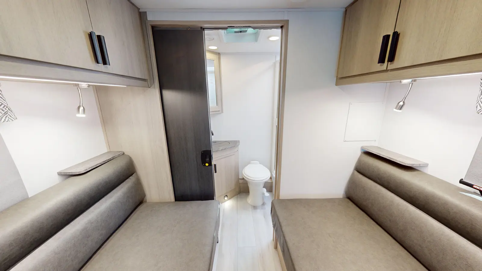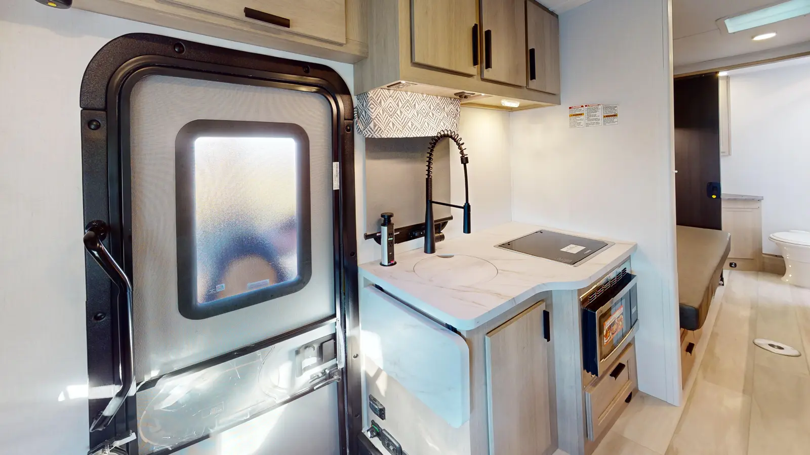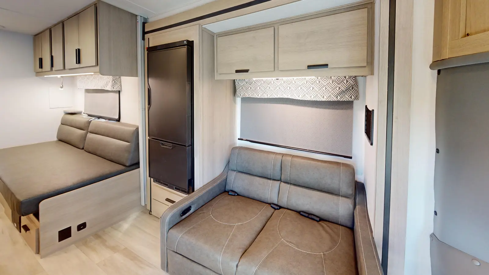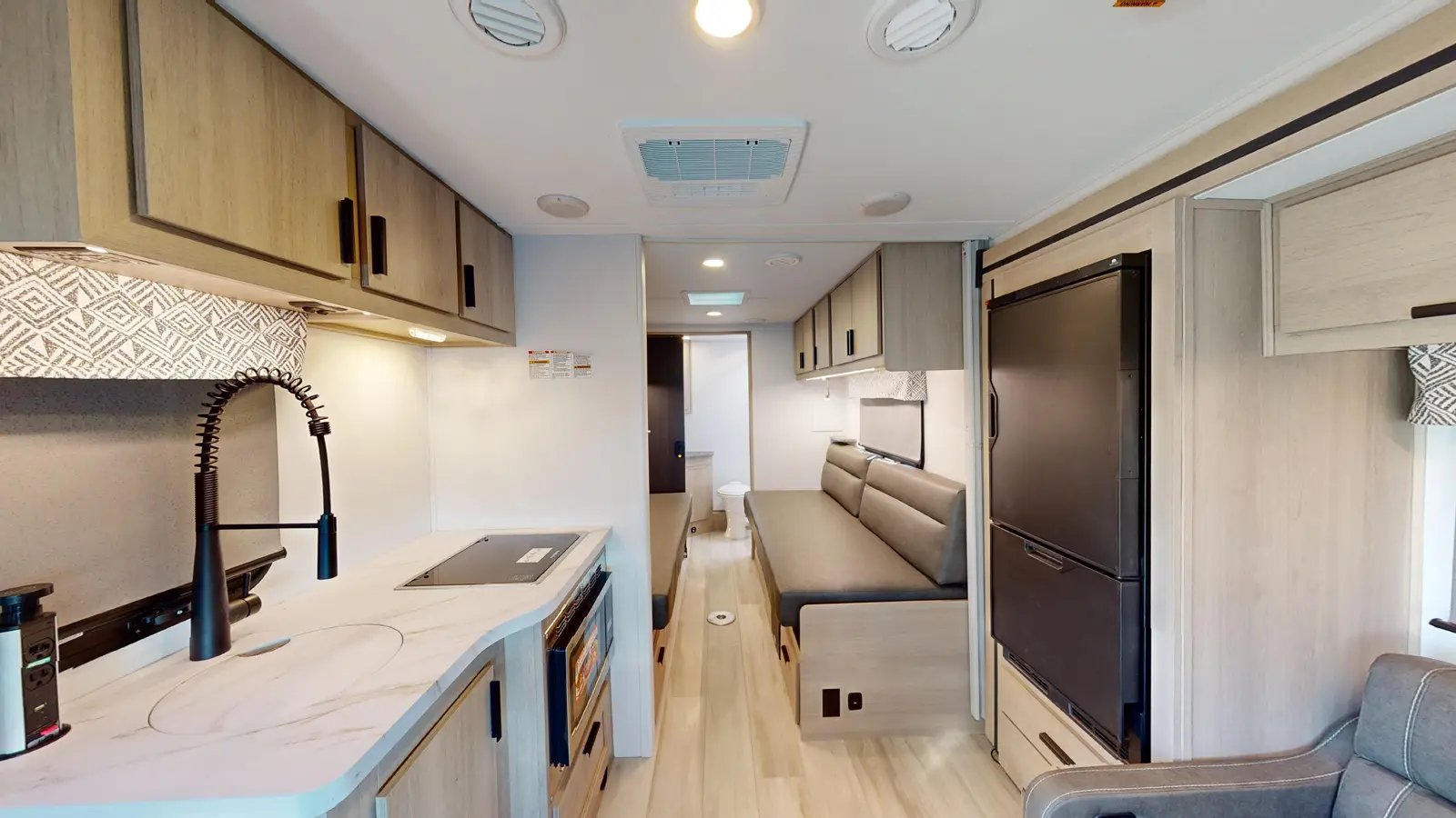 The Forester TS2371 is the perfect couple's coach with twin beds, a rear full bathroom with a shower, and a wardrobe for your things. A love seat with table is perfect for dining, with a fully equipped kitchen that includes a stovetop, convection microwave, flip-up countertop for extra space, and a 10.7 CU FT 12 V residential-style stainless steel refrigerator. The rear bath includes a 24" x 36" skylight shower, commode, vanity sink with extended countertop, and medicine cabinet.
