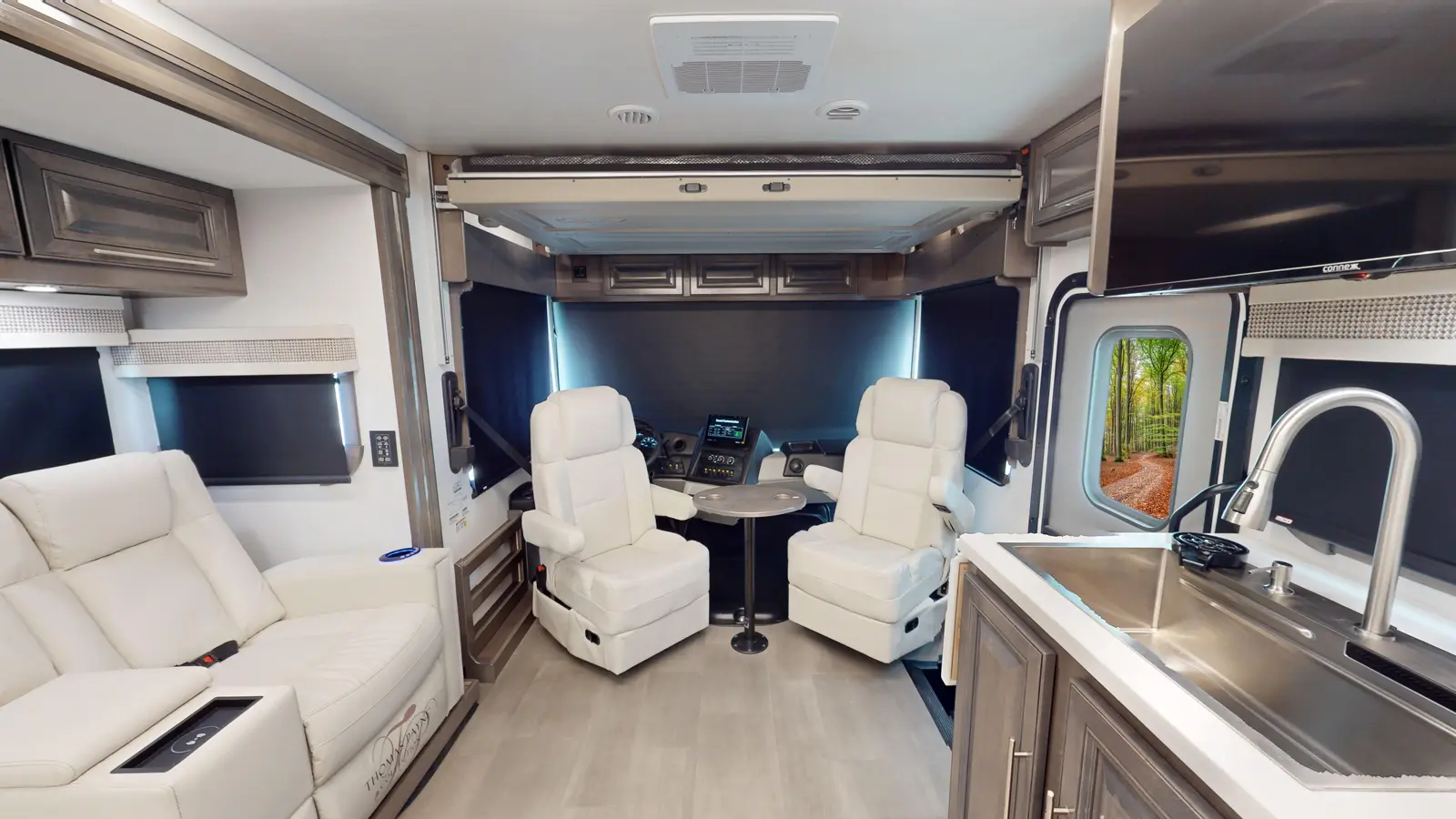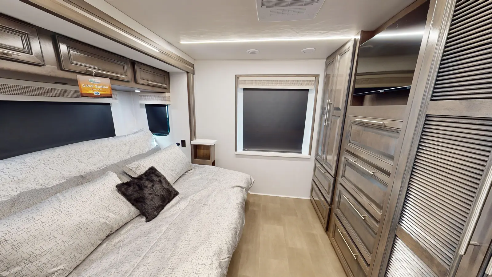 Our Georgetown 31X7 by Forest River is perfect for travelers looking for a compact and easy to drive motorhome coming in at 33ft 11in. The bedroom makes no sacrifices with a king size bed slide, washer/dryer prep and lots of wardrobe space. You also still get a full bathroom with the shower split making it convenient for your partner to shower while you get ready by the sink. There's also plenty of seating up front for guests and the dinette converts into a bed for occasional guests!