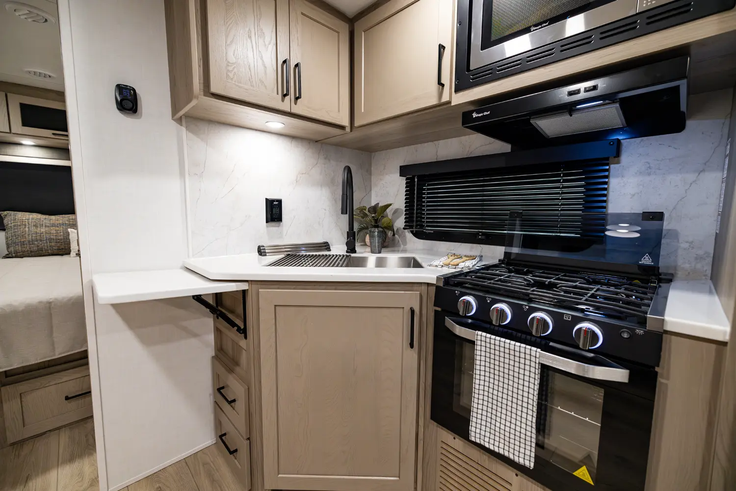 • Platinum Package: Auto Leveling, Frameless Windows, 1800W Inverter, MORryde Strut Assist Entry Step, Dual 30 LP Tanks